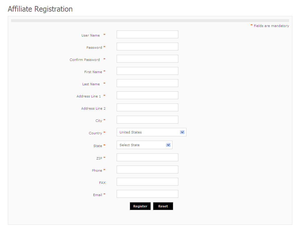 Registering with {SITE_NAME} as an affiliate is easy and fast. Go to the registration page (typically at http://yoursite.com/affiliates/register.php assuming that the Mulicart is installed at http://yoursite.com) and provide the very basic information. Registration is FREE and valid for life time.